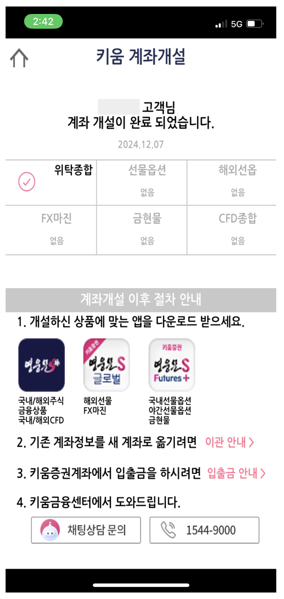 키움증권 계좌의 개설이 완료되었습니다.
