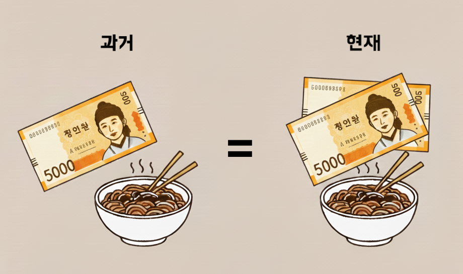 이제는 5,000원짜리 지폐가 두 개가 있어야만 같은 짜장면 한 그릇을 살 수 있게 된 것이죠.